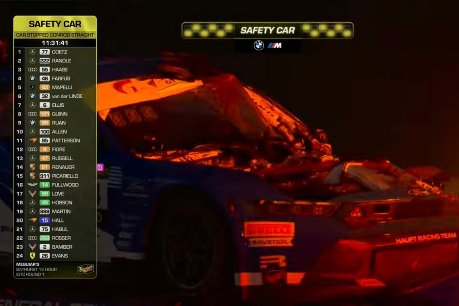 Partita come sempre alle primissime ore dell'alba, la gara del Mount Panorama è stata neutralizzata con l'ingresso della Safety Car quando ancora il sole doveva sorgere, dato che la Ford #64 era parcheggiata a bordo pista.